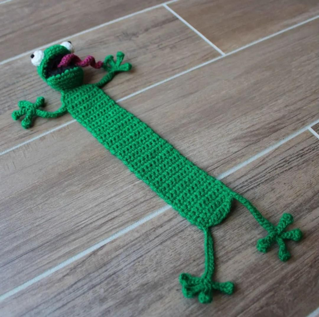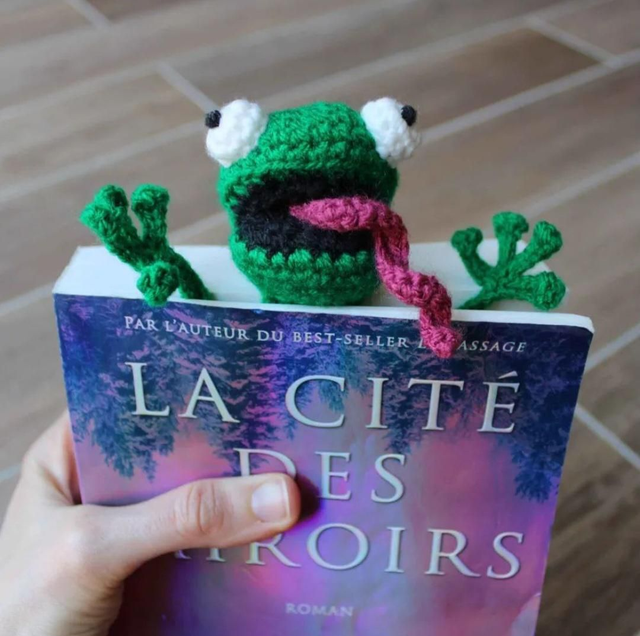 Marque page rigolo en forme de grenouille écrasée, crocheté par mes soins